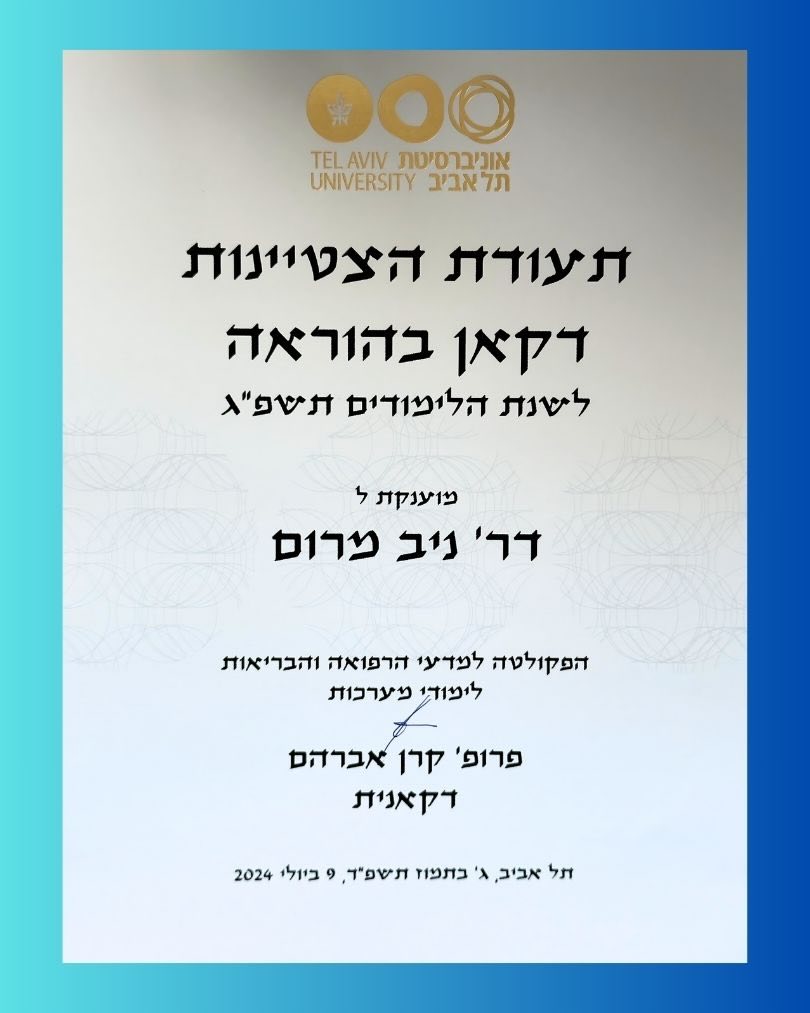 ד"ר ניב מרום נבחר כמרצה מצטיין בפקולטה למדעי הרפואה והבריאות באוניברסיטת ת"א. תעודת ההצטיינות הוענקה לד"ר מרום לפני מספר ימים על ידי דיקאנית הפקולטה בטקס מרגש. ד"ר מרום מרכז ומעביר מספר קורסים בפקולטה במסגרת תפקידו האקדמי כמרצה בכיר.